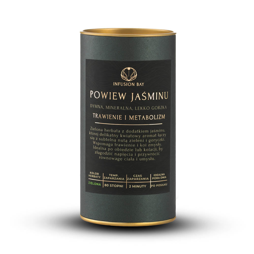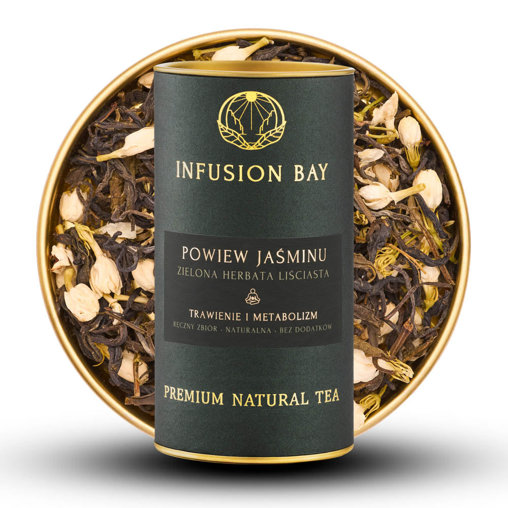 Subtelna, harmonijna i pełna lekkości – taki jest Powiew Jaśminu, zielona herbata z dodatkiem świeżych kwiatów jaśminu. Jej delikatny aromat łączy się z naturalną nutą zieleni i lekką goryczką, tworząc napar, który uspokaja zmysły i wspiera trawienie. To herbata, która przynosi ukojenie po posiłku – łagodzi ciało, oczyszcza umysł i przywraca wewnętrzną równowagę.