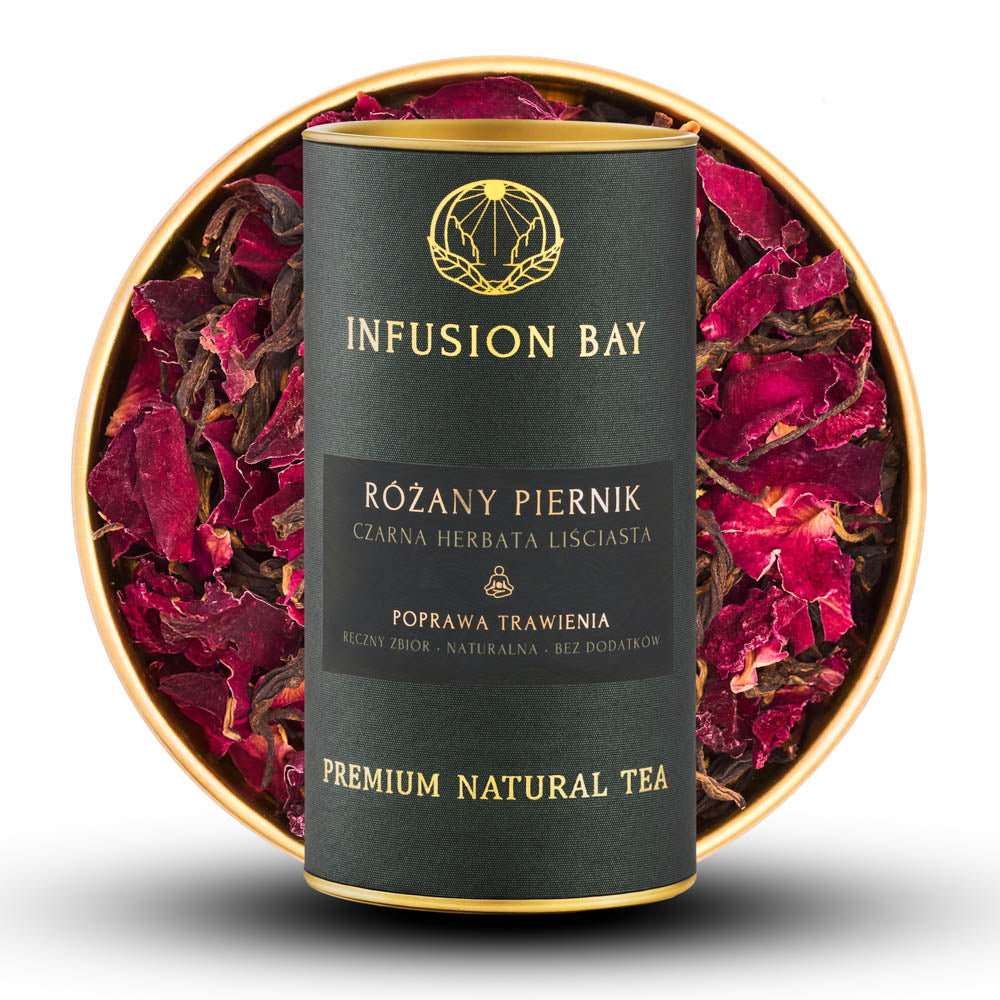 Po zaparzeniu napar ma barwę głębokiego bursztynu z lekko złocistym połyskiem. W aromacie dominuje róża – miękka, lekko pudrowa – wsparta ciepłem czarnej herbaty. W smaku Różany Piernik jest łagodny, gładki i przyjemnie słodki, pozostawiając na języku nutę karmelu i kwiatów. Każdy łyk koi, rozgrzewa i wprowadza spokój po posiłku. To napar, który łączy elegancję z naturalnym komfortem – idealny na spokojne popołudnia lub wieczorny relaks.