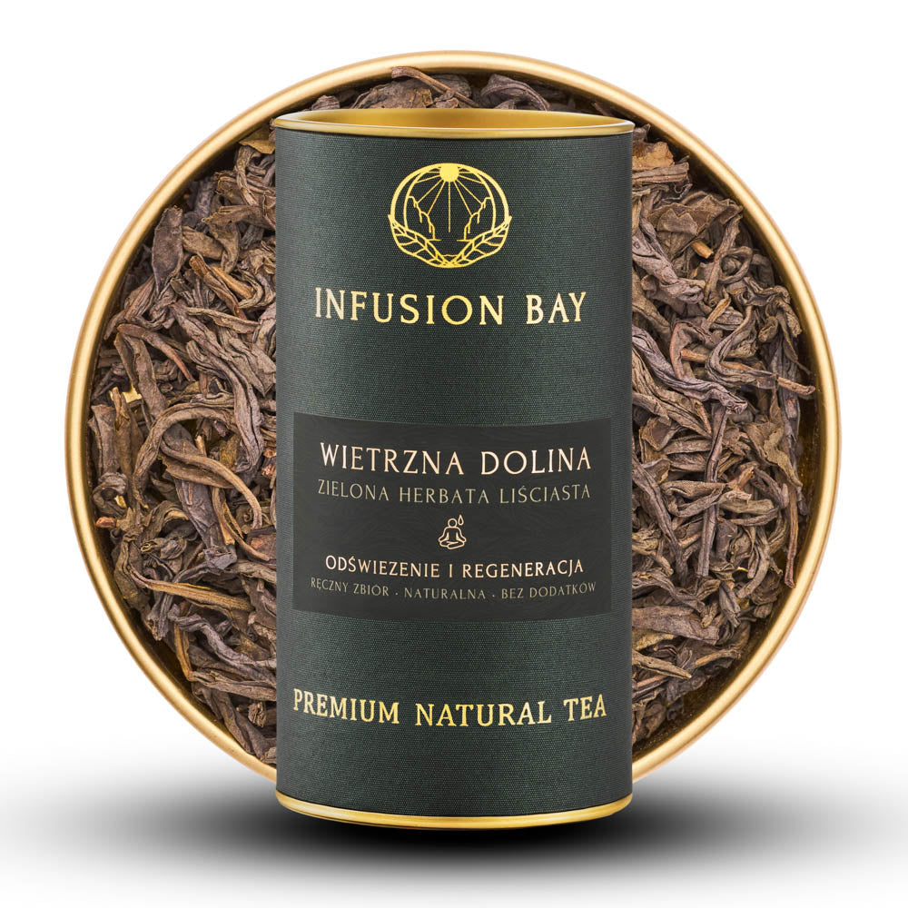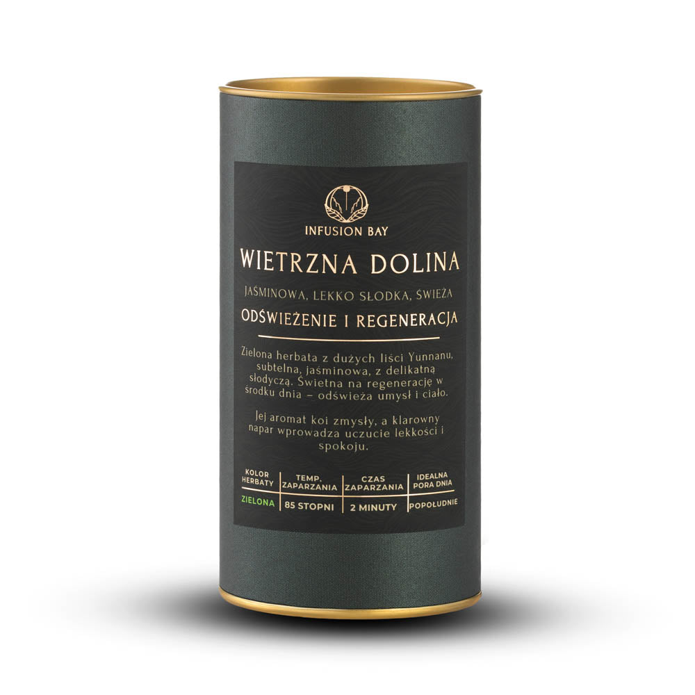 Po zaparzeniu napar przybiera kolor jasnego złota, a jego zapach otula zmysły aromatem kwiatów i owoców. W smaku Wietrzna Dolina jest gładka i świeża – zrównoważona, bez cienia goryczki. Przynosi uczucie czystości i delikatnego pobudzenia, niczym lekki powiew w ciepły dzień. To herbata, która działa jak oddech – prosty, naturalny i pełen życia.